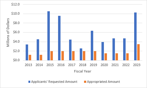 Figure 1 – CRDLF grant awards and applicants’ requested amounts 2013–2023