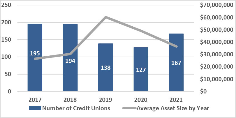 The following chart summarizes the number of mergers by year and the average asset size of the merging credit unions.