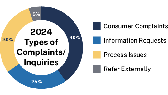 Year over year, the total number of inquiries and complaints to the Ombudsman from the public have increased. In 2024, the Ombudsman processed a total of 598 inquiries or complaints, an increase of 33 percent from the previous year.